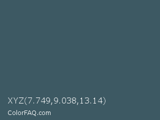 XYZ 7.749,9.038,13.14 Color is a normal blue color and the nearest color is Fiord #405169. Hex code #3d5963 and RGB value is rgb(61,89,99). In RGB color space, this color is composed of 24% red, 35% green, 39% blue, In CMYK color space, this color is composed of 38% cyan, 10% magenta, 0% yellow , 61% black , In HSL color space, this color has a hue angle of 196° , 24% saturation and 31% lightness.