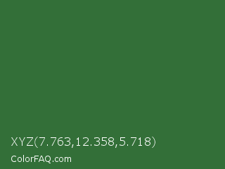 XYZ 7.763,12.358,5.718 Color is a normal green color and the nearest color is Mughal Green #306030. Hex code #336f38 and RGB value is rgb(51,111,56). In RGB color space, this color is composed of 20% red, 44% green, 22% blue, In CMYK color space, this color is composed of 54% cyan, 0% magenta, 50% yellow , 56% black , In HSL color space, this color has a hue angle of 125° , 37% saturation and 32% lightness.