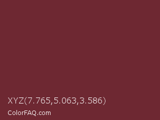 XYZ 7.765,5.063,3.586 Color is a dark red color and the nearest color is Wine #722f37. Hex code #6e2832 and RGB value is rgb(110,40,50). In RGB color space, this color is composed of 43% red, 16% green, 20% blue, In CMYK color space, this color is composed of 0% cyan, 64% magenta, 55% yellow , 57% black , In HSL color space, this color has a hue angle of 351° , 47% saturation and 29% lightness.