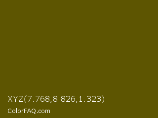 XYZ 7.768,8.826,1.323 Color is a very dark yellow color and the nearest color is Saratoga #555b10. Hex code #5d5501 and RGB value is rgb(93,85,1). In RGB color space, this color is composed of 36% red, 33% green, 0% blue, In CMYK color space, this color is composed of 0% cyan, 9% magenta, 99% yellow , 64% black , In HSL color space, this color has a hue angle of 55° , 98% saturation and 18% lightness.