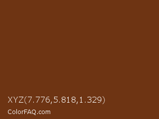 XYZ 7.776,5.818,1.329 Color is a dark orange color and the nearest color is Hairy Heath #6b2a14. Hex code #6e3413 and RGB value is rgb(110,52,19). In RGB color space, this color is composed of 43% red, 20% green, 7% blue, In CMYK color space, this color is composed of 0% cyan, 53% magenta, 83% yellow , 57% black , In HSL color space, this color has a hue angle of 22° , 71% saturation and 25% lightness.