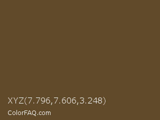 XYZ 7.796,7.606,3.248 Color is a dark orange color and the nearest color is Donkey Brown #664c28. Hex code #614a2a and RGB value is rgb(97,74,42). In RGB color space, this color is composed of 38% red, 29% green, 16% blue, In CMYK color space, this color is composed of 0% cyan, 24% magenta, 57% yellow , 62% black , In HSL color space, this color has a hue angle of 35° , 40% saturation and 27% lightness.