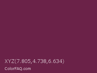 XYZ 7.805,4.738,6.634 Color is a dark rose color and the nearest color is Tawny Port #692545. Hex code #6b2248 and RGB value is rgb(107,34,72). In RGB color space, this color is composed of 42% red, 13% green, 28% blue, In CMYK color space, this color is composed of 0% cyan, 68% magenta, 33% yellow , 58% black , In HSL color space, this color has a hue angle of 329° , 52% saturation and 28% lightness.