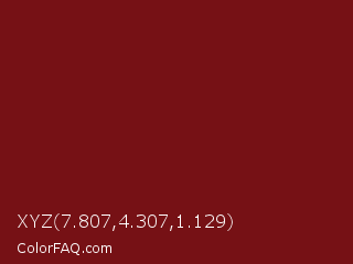 XYZ 7.807,4.307,1.129 Color is a dark red color and the nearest color is UP Maroon #7b1113. Hex code #761115 and RGB value is rgb(118,17,21). In RGB color space, this color is composed of 46% red, 7% green, 8% blue, In CMYK color space, this color is composed of 0% cyan, 86% magenta, 82% yellow , 54% black , In HSL color space, this color has a hue angle of 358° , 75% saturation and 26% lightness.