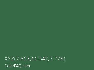 XYZ 7.813,11.547,7.778 Color is a normal green color and the nearest color is Killarney #3a6a47. Hex code #366a47 and RGB value is rgb(54,106,71). In RGB color space, this color is composed of 21% red, 42% green, 28% blue, In CMYK color space, this color is composed of 49% cyan, 0% magenta, 33% yellow , 58% black , In HSL color space, this color has a hue angle of 140° , 33% saturation and 31% lightness.
