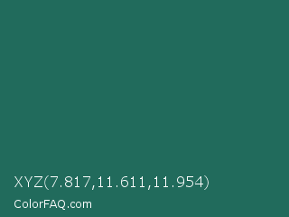 XYZ 7.817,11.611,11.954 Color is a dark cyan color and the nearest color is Genoa #15736b. Hex code #216b5c and RGB value is rgb(33,107,92). In RGB color space, this color is composed of 13% red, 42% green, 36% blue, In CMYK color space, this color is composed of 69% cyan, 0% magenta, 14% yellow , 58% black , In HSL color space, this color has a hue angle of 168° , 53% saturation and 27% lightness.
