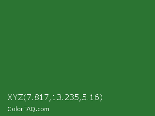 XYZ 7.817,13.235,5.16 Color is a normal green color and the nearest color is Mughal Green #306030. Hex code #2b7432 and RGB value is rgb(43,116,50). In RGB color space, this color is composed of 17% red, 45% green, 20% blue, In CMYK color space, this color is composed of 63% cyan, 0% magenta, 57% yellow , 55% black , In HSL color space, this color has a hue angle of 126° , 46% saturation and 31% lightness.