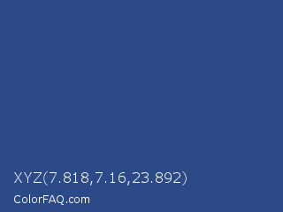 XYZ 7.818,7.16,23.892 Color is a normal blue color and the nearest color is Chambray #354e8c. Hex code #2b4a87 and RGB value is rgb(43,74,135). In RGB color space, this color is composed of 17% red, 29% green, 53% blue, In CMYK color space, this color is composed of 68% cyan, 45% magenta, 0% yellow , 47% black , In HSL color space, this color has a hue angle of 220° , 52% saturation and 35% lightness.
