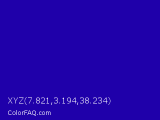 XYZ 7.821,3.194,38.234 Color is a normal indigo color and the nearest color is Ultramarine #120a8f. Hex code #1f00aa and RGB value is rgb(31,0,170). In RGB color space, this color is composed of 12% red, 0% green, 67% blue, In CMYK color space, this color is composed of 82% cyan, 100% magenta, 0% yellow , 33% black , In HSL color space, this color has a hue angle of 251° , 100% saturation and 33% lightness.