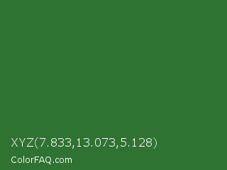 XYZ 7.833,13.073,5.128 Color is a normal green color and the nearest color is Mughal Green #306030. Hex code #2e7332 and RGB value is rgb(46,115,50). In RGB color space, this color is composed of 18% red, 45% green, 20% blue, In CMYK color space, this color is composed of 60% cyan, 0% magenta, 57% yellow , 55% black , In HSL color space, this color has a hue angle of 123° , 43% saturation and 32% lightness.