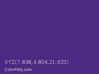 XYZ 7.838,4.804,21.633 Color is a normal violet color and the nearest color is Spanish Violet #4c2882. Hex code #4c2a82 and RGB value is rgb(76,42,130). In RGB color space, this color is composed of 30% red, 16% green, 51% blue, In CMYK color space, this color is composed of 42% cyan, 68% magenta, 0% yellow , 49% black , In HSL color space, this color has a hue angle of 263° , 51% saturation and 34% lightness.