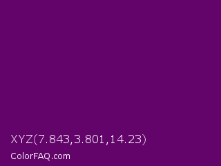 XYZ 7.843,3.801,14.23 Color is a very dark magenta color and the nearest color is Honey Flower #4f1c70. Hex code #63046b and RGB value is rgb(99,4,107). In RGB color space, this color is composed of 39% red, 2% green, 42% blue, In CMYK color space, this color is composed of 7% cyan, 96% magenta, 0% yellow , 58% black , In HSL color space, this color has a hue angle of 295° , 93% saturation and 22% lightness.