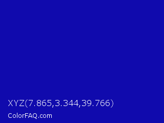XYZ 7.865,3.344,39.766 Color is a normal indigo color and the nearest color is Zaffre #0014a8. Hex code #100aad and RGB value is rgb(16,10,173). In RGB color space, this color is composed of 6% red, 4% green, 68% blue, In CMYK color space, this color is composed of 91% cyan, 94% magenta, 0% yellow , 32% black , In HSL color space, this color has a hue angle of 242° , 89% saturation and 36% lightness.