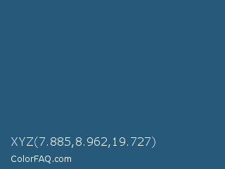 XYZ 7.885,8.962,19.727 Color is a normal blue color and the nearest color is Blumine #18587a. Hex code #26597a and RGB value is rgb(38,89,122). In RGB color space, this color is composed of 15% red, 35% green, 48% blue, In CMYK color space, this color is composed of 69% cyan, 27% magenta, 0% yellow , 52% black , In HSL color space, this color has a hue angle of 204° , 53% saturation and 31% lightness.