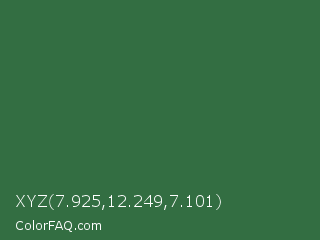 XYZ 7.925,12.249,7.101 Color is a normal green color and the nearest color is Killarney #3a6a47. Hex code #336e42 and RGB value is rgb(51,110,66). In RGB color space, this color is composed of 20% red, 43% green, 26% blue, In CMYK color space, this color is composed of 54% cyan, 0% magenta, 40% yellow , 57% black , In HSL color space, this color has a hue angle of 135° , 37% saturation and 32% lightness.
