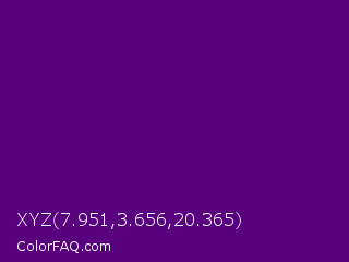 XYZ 7.951,3.656,20.365 Color is a dark purple color and the nearest color is Pigment Indigo #4b0082. Hex code #59007f and RGB value is rgb(89,0,127). In RGB color space, this color is composed of 35% red, 0% green, 50% blue, In CMYK color space, this color is composed of 30% cyan, 100% magenta, 0% yellow , 50% black , In HSL color space, this color has a hue angle of 282° , 100% saturation and 25% lightness.