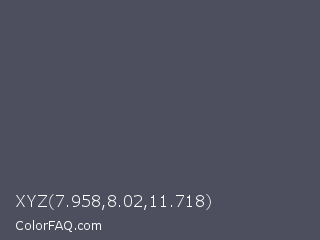 XYZ 7.958,8.02,11.718 Color is a normal blue color and the nearest color is Trout #4a4e5a. Hex code #4e4f5e and RGB value is rgb(78,79,94). In RGB color space, this color is composed of 31% red, 31% green, 37% blue, In CMYK color space, this color is composed of 17% cyan, 16% magenta, 0% yellow , 63% black , In HSL color space, this color has a hue angle of 236° , 9% saturation and 34% lightness.