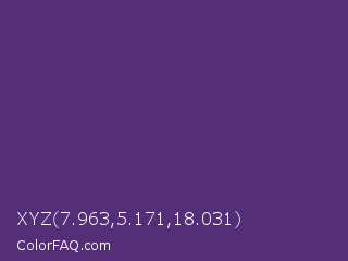 XYZ 7.963,5.171,18.031 Color is a normal purple color and the nearest color is Regalia #522d80. Hex code #542e77 and RGB value is rgb(84,46,119). In RGB color space, this color is composed of 33% red, 18% green, 47% blue, In CMYK color space, this color is composed of 29% cyan, 61% magenta, 0% yellow , 53% black , In HSL color space, this color has a hue angle of 271° , 44% saturation and 32% lightness.