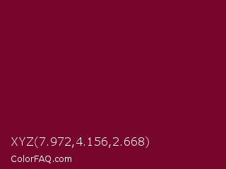 XYZ 7.972,4.156,2.668 Color is a dark rose color and the nearest color is Black Rose #67032d. Hex code #76062b and RGB value is rgb(118,6,43). In RGB color space, this color is composed of 46% red, 2% green, 17% blue, In CMYK color space, this color is composed of 0% cyan, 95% magenta, 64% yellow , 54% black , In HSL color space, this color has a hue angle of 340° , 90% saturation and 24% lightness.