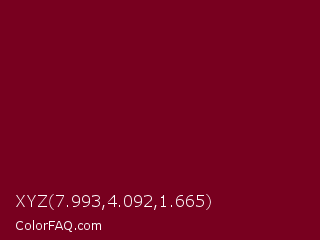 XYZ 7.993,4.092,1.665 Color is a dark red color and the nearest color is Burgundy #800020. Hex code #78001f and RGB value is rgb(120,0,31). In RGB color space, this color is composed of 47% red, 0% green, 12% blue, In CMYK color space, this color is composed of 0% cyan, 100% magenta, 74% yellow , 53% black , In HSL color space, this color has a hue angle of 345° , 100% saturation and 24% lightness.