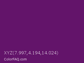XYZ 7.997,4.194,14.024 Color is a dark magenta color and the nearest color is Honey Flower #4f1c70. Hex code #63146a and RGB value is rgb(99,20,106). In RGB color space, this color is composed of 39% red, 8% green, 42% blue, In CMYK color space, this color is composed of 7% cyan, 81% magenta, 0% yellow , 58% black , In HSL color space, this color has a hue angle of 295° , 68% saturation and 25% lightness.