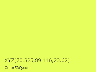 XYZ 70.325,89.116,23.62 Color is a light yellow color and the nearest color is Canary #f3fb62. Hex code #e6ff5c and RGB value is rgb(230,255,92). In RGB color space, this color is composed of 90% red, 100% green, 36% blue, In CMYK color space, this color is composed of 10% cyan, 0% magenta, 64% yellow , 0% black , In HSL color space, this color has a hue angle of 69° , 100% saturation and 68% lightness.