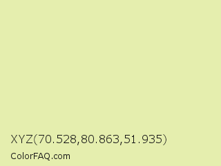 XYZ 70.528,80.863,51.935 Color is a very light yellow color and the nearest color is Caper #dcedb4. Hex code #e5eeae and RGB value is rgb(229,238,174). In RGB color space, this color is composed of 90% red, 93% green, 68% blue, In CMYK color space, this color is composed of 4% cyan, 0% magenta, 27% yellow , 7% black , In HSL color space, this color has a hue angle of 68° , 65% saturation and 81% lightness.