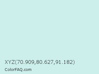 XYZ 70.909,80.627,91.182 Color is a very light cyan color and the nearest color is Mint Tulip #c4f4eb. Hex code #ccefec and RGB value is rgb(204,239,236). In RGB color space, this color is composed of 80% red, 94% green, 93% blue, In CMYK color space, this color is composed of 15% cyan, 0% magenta, 1% yellow , 6% black , In HSL color space, this color has a hue angle of 175° , 52% saturation and 87% lightness.
