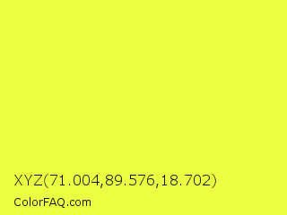 XYZ 71.004,89.576,18.702 Color is a light yellow color and the nearest color is Golden Fizz #f5fb3d. Hex code #ebff42 and RGB value is rgb(235,255,66). In RGB color space, this color is composed of 92% red, 100% green, 26% blue, In CMYK color space, this color is composed of 8% cyan, 0% magenta, 74% yellow , 0% black , In HSL color space, this color has a hue angle of 66° , 100% saturation and 63% lightness.