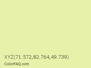 XYZ 71.572,82.764,49.739 Color is a light yellow color and the nearest color is Pale Goldenrod #eee8aa. Hex code #e7f1a9 and RGB value is rgb(231,241,169). In RGB color space, this color is composed of 91% red, 95% green, 66% blue, In CMYK color space, this color is composed of 4% cyan, 0% magenta, 30% yellow , 5% black , In HSL color space, this color has a hue angle of 68° , 72% saturation and 80% lightness.