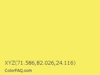 XYZ 71.586,82.026,24.116 Color is a light yellow color and the nearest color is Candy Corn #fbec5d. Hex code #f8ee64 and RGB value is rgb(248,238,100). In RGB color space, this color is composed of 97% red, 93% green, 39% blue, In CMYK color space, this color is composed of 0% cyan, 4% magenta, 60% yellow , 3% black , In HSL color space, this color has a hue angle of 56° , 91% saturation and 68% lightness.
