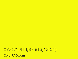 XYZ 71.914,87.813,13.54 Color is a normal yellow color and the nearest color is Lemon Glacier #fdff00. Hex code #f5fa0d and RGB value is rgb(245,250,13). In RGB color space, this color is composed of 96% red, 98% green, 5% blue, In CMYK color space, this color is composed of 2% cyan, 0% magenta, 95% yellow , 2% black , In HSL color space, this color has a hue angle of 61° , 96% saturation and 52% lightness.