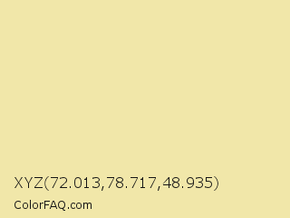 XYZ 72.013,78.717,48.935 Color is a light yellow color and the nearest color is Pale Goldenrod #eee8aa. Hex code #f1e7a9 and RGB value is rgb(241,231,169). In RGB color space, this color is composed of 95% red, 91% green, 66% blue, In CMYK color space, this color is composed of 0% cyan, 4% magenta, 30% yellow , 5% black , In HSL color space, this color has a hue angle of 52° , 72% saturation and 80% lightness.