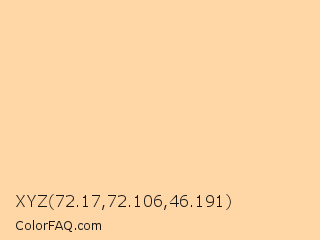 XYZ 72.17,72.106,46.191 Color is a very light orange color and the nearest color is Deep Champagne #fad6a5. Hex code #ffd6a6 and RGB value is rgb(255,214,166). In RGB color space, this color is composed of 100% red, 84% green, 65% blue, In CMYK color space, this color is composed of 0% cyan, 16% magenta, 35% yellow , 0% black , In HSL color space, this color has a hue angle of 32° , 100% saturation and 83% lightness.