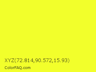 XYZ 72.814,90.572,15.93 Color is a normal yellow color and the nearest color is Daffodil #ffff31. Hex code #f2ff2b and RGB value is rgb(242,255,43). In RGB color space, this color is composed of 95% red, 100% green, 17% blue, In CMYK color space, this color is composed of 5% cyan, 0% magenta, 83% yellow , 0% black , In HSL color space, this color has a hue angle of 64° , 100% saturation and 58% lightness.