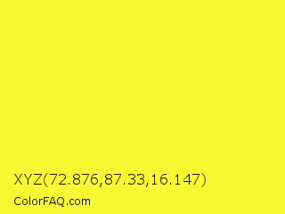 XYZ 72.876,87.33,16.147 Color is a normal yellow color and the nearest color is Maximum Yellow #fafa37. Hex code #f8f833 and RGB value is rgb(248,248,51). In RGB color space, this color is composed of 97% red, 97% green, 20% blue, In CMYK color space, this color is composed of 0% cyan, 0% magenta, 79% yellow , 3% black , In HSL color space, this color has a hue angle of 60° , 93% saturation and 59% lightness.