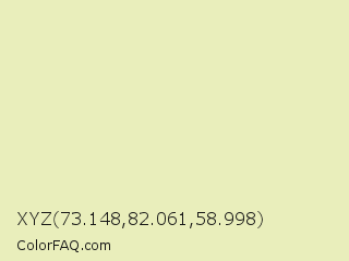 XYZ 73.148,82.061,58.998 Color is a very light yellow color and the nearest color is Fall Green #ecebbd. Hex code #e9eebb and RGB value is rgb(233,238,187). In RGB color space, this color is composed of 91% red, 93% green, 73% blue, In CMYK color space, this color is composed of 2% cyan, 0% magenta, 21% yellow , 7% black , In HSL color space, this color has a hue angle of 66° , 60% saturation and 83% lightness.