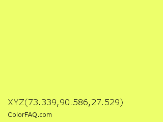 XYZ 73.339,90.586,27.529 Color is a light yellow color and the nearest color is Canary #f3fb62. Hex code #edff6b and RGB value is rgb(237,255,107). In RGB color space, this color is composed of 93% red, 100% green, 42% blue, In CMYK color space, this color is composed of 7% cyan, 0% magenta, 58% yellow , 0% black , In HSL color space, this color has a hue angle of 67° , 100% saturation and 71% lightness.