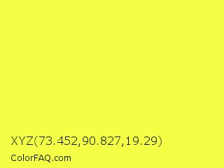 XYZ 73.452,90.827,19.29 Color is a light yellow color and the nearest color is Golden Fizz #f5fb3d. Hex code #f2ff45 and RGB value is rgb(242,255,69). In RGB color space, this color is composed of 95% red, 100% green, 27% blue, In CMYK color space, this color is composed of 5% cyan, 0% magenta, 73% yellow , 0% black , In HSL color space, this color has a hue angle of 64° , 100% saturation and 64% lightness.