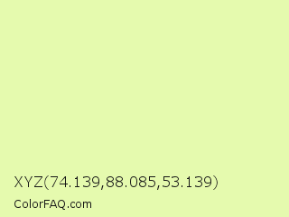 XYZ 74.139,88.085,53.139 Color is a very light lime color and the nearest color is Tidal #f1ffad. Hex code #e5faae and RGB value is rgb(229,250,174). In RGB color space, this color is composed of 90% red, 98% green, 68% blue, In CMYK color space, this color is composed of 8% cyan, 0% magenta, 30% yellow , 2% black , In HSL color space, this color has a hue angle of 77° , 88% saturation and 83% lightness.