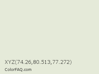 XYZ 74.26,80.513,77.272 Color is a very light lime color and the nearest color is Periglacial Blue #e1e6d6. Hex code #e5ead9 and RGB value is rgb(229,234,217). In RGB color space, this color is composed of 90% red, 92% green, 85% blue, In CMYK color space, this color is composed of 2% cyan, 0% magenta, 7% yellow , 8% black , In HSL color space, this color has a hue angle of 78° , 29% saturation and 88% lightness.