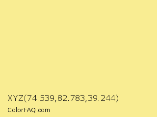 XYZ 74.539,82.783,39.244 Color is a light yellow color and the nearest color is Flavescent #f7e98e. Hex code #f9ed92 and RGB value is rgb(249,237,146). In RGB color space, this color is composed of 98% red, 93% green, 57% blue, In CMYK color space, this color is composed of 0% cyan, 5% magenta, 41% yellow , 2% black , In HSL color space, this color has a hue angle of 53° , 90% saturation and 77% lightness.