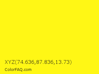 XYZ 74.636,87.836,13.73 Color is a normal yellow color and the nearest color is Broom #ffec13. Hex code #fff715 and RGB value is rgb(255,247,21). In RGB color space, this color is composed of 100% red, 97% green, 8% blue, In CMYK color space, this color is composed of 0% cyan, 3% magenta, 92% yellow , 0% black , In HSL color space, this color has a hue angle of 58° , 100% saturation and 54% lightness.