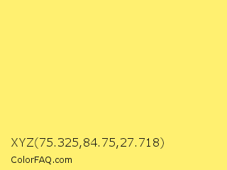 XYZ 75.325,84.75,27.718 Color is a light yellow color and the nearest color is Paris Daisy #fff46e. Hex code #fff070 and RGB value is rgb(255,240,112). In RGB color space, this color is composed of 100% red, 94% green, 44% blue, In CMYK color space, this color is composed of 0% cyan, 6% magenta, 56% yellow , 0% black , In HSL color space, this color has a hue angle of 54° , 100% saturation and 72% lightness.