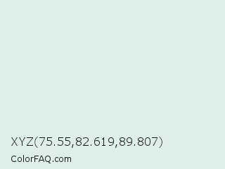 XYZ 75.55,82.619,89.807 Color is a very light cyan color and the nearest color is Swans Down #dcf0ea. Hex code #deeeea and RGB value is rgb(222,238,234). In RGB color space, this color is composed of 87% red, 93% green, 92% blue, In CMYK color space, this color is composed of 7% cyan, 0% magenta, 2% yellow , 7% black , In HSL color space, this color has a hue angle of 165° , 32% saturation and 90% lightness.