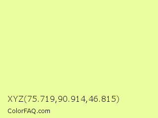 XYZ 75.719,90.914,46.815 Color is a very light lime color and the nearest color is Jonquil #eeff9a. Hex code #eafea0 and RGB value is rgb(234,254,160). In RGB color space, this color is composed of 92% red, 100% green, 63% blue, In CMYK color space, this color is composed of 8% cyan, 0% magenta, 37% yellow , 0% black , In HSL color space, this color has a hue angle of 73° , 98% saturation and 81% lightness.