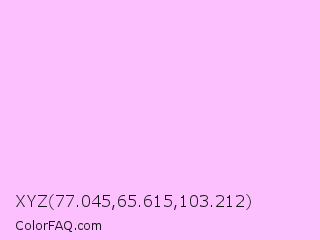 XYZ 77.045,65.615,103.212 Color is a very light magenta color and the nearest color is Electric Lavender #f4bbff. Hex code #fcc0ff and RGB value is rgb(252,192,255). In RGB color space, this color is composed of 99% red, 75% green, 100% blue, In CMYK color space, this color is composed of 1% cyan, 25% magenta, 0% yellow , 0% black , In HSL color space, this color has a hue angle of 297° , 100% saturation and 88% lightness.