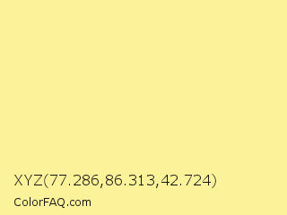 XYZ 77.286,86.313,42.724 Color is a light yellow color and the nearest color is Picasso #fff39d. Hex code #fbf299 and RGB value is rgb(251,242,153). In RGB color space, this color is composed of 98% red, 95% green, 60% blue, In CMYK color space, this color is composed of 0% cyan, 4% magenta, 39% yellow , 2% black , In HSL color space, this color has a hue angle of 54° , 92% saturation and 79% lightness.