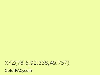 XYZ 78.6,92.338,49.757 Color is a very light yellow color and the nearest color is Tidal #f1ffad. Hex code #f1fea6 and RGB value is rgb(241,254,166). In RGB color space, this color is composed of 95% red, 100% green, 65% blue, In CMYK color space, this color is composed of 5% cyan, 0% magenta, 35% yellow , 0% black , In HSL color space, this color has a hue angle of 69° , 98% saturation and 82% lightness.