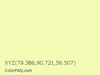 XYZ 79.386,90.721,56.507 Color is a very light yellow color and the nearest color is Tidal #f1ffad. Hex code #f3fab4 and RGB value is rgb(243,250,180). In RGB color space, this color is composed of 95% red, 98% green, 71% blue, In CMYK color space, this color is composed of 3% cyan, 0% magenta, 28% yellow , 2% black , In HSL color space, this color has a hue angle of 66° , 88% saturation and 84% lightness.